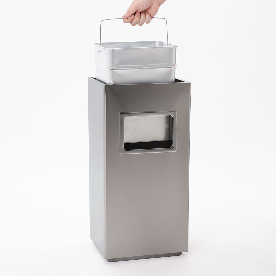 Cenicero de pie con papelera exterior de 15 litros, con forma rectangular y disponible en color negro opaco o acero. Perfecto para su uso en bares y tiendas de todo tipo. Su diseño permite la eliminación segura de las colillas de cigarrillos, mientras que la papelera integrada ayuda a mantener el área limpia y organizada. Resistente a la intemperie, duradero y fácil de limpiar. Instalación de pie, fácilmente accesible desde cualquier lugar.