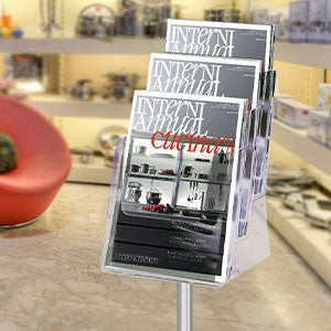 Expositores de pie plateado para alojar folletos y catálogos en formato A4. Portafolletos de metacrilato disponibles en varios niveles: con 1 o 3 compartimentos. Estructura con soporte de aluminio, díametro 30 mm y con base de metal, díametro 35 cm. Ideal para tiendas, empresas o museos. Añadir al carrito ahora.