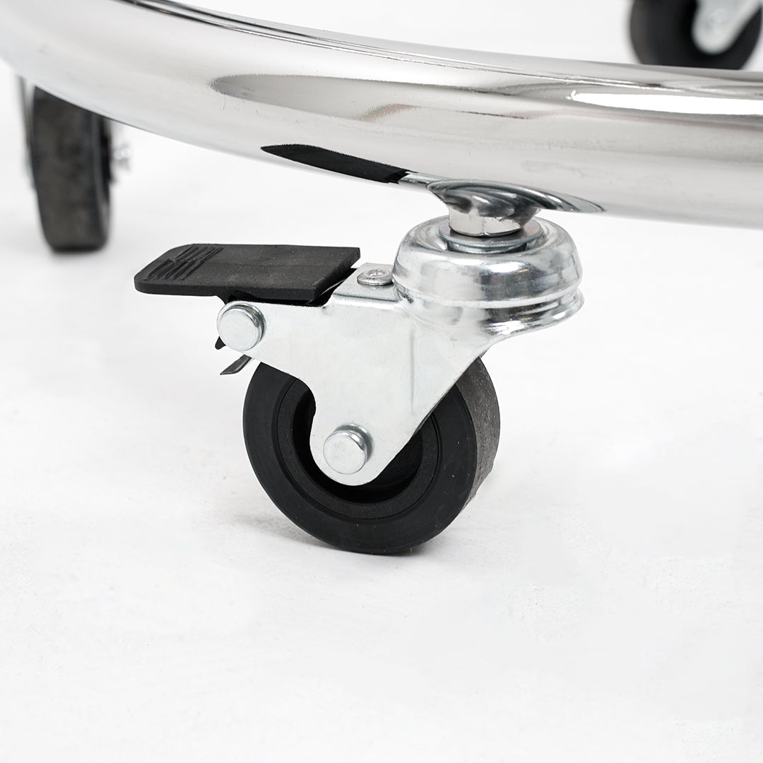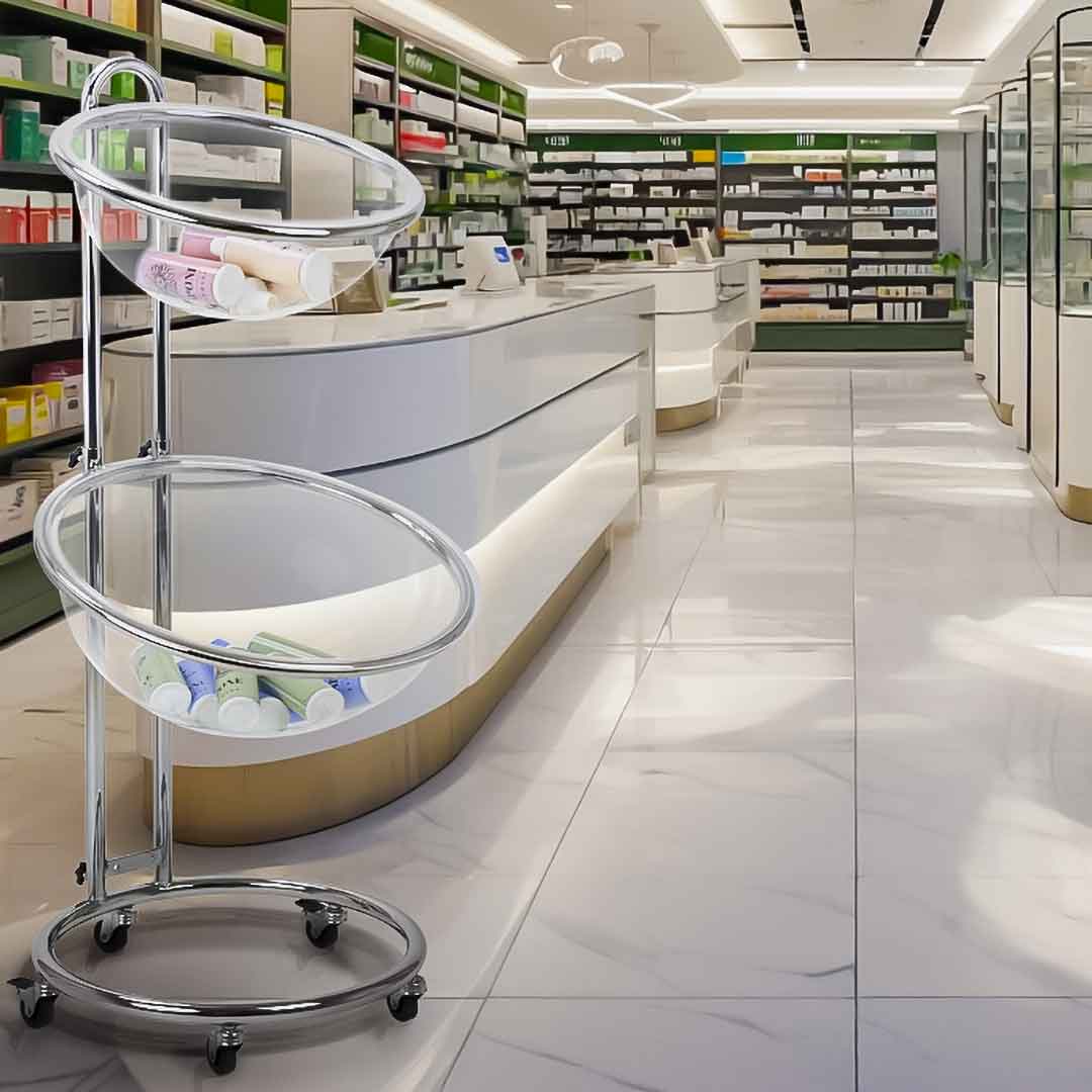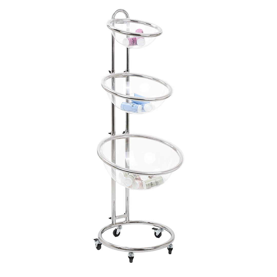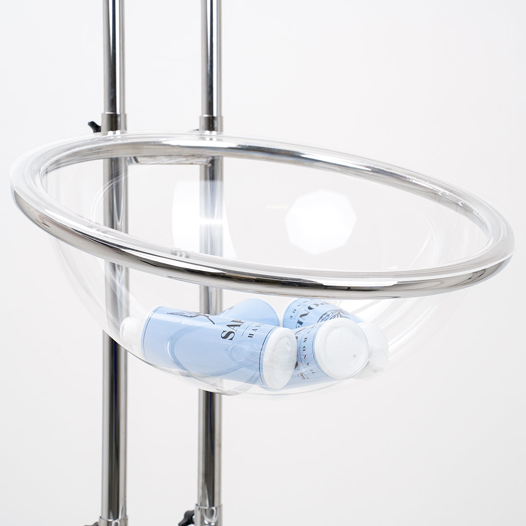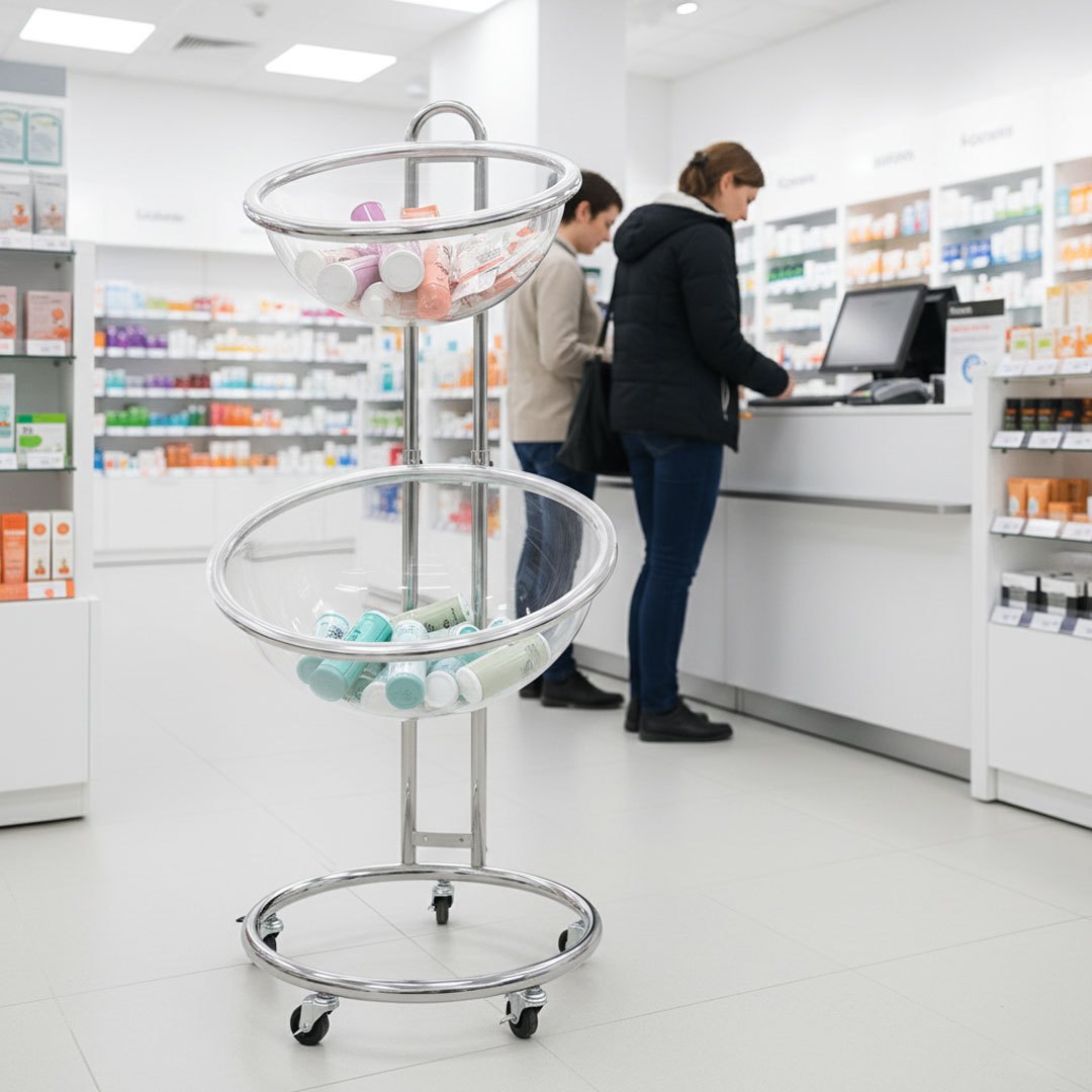 El expositor de pie combina una estructura en acero cromado con semiesferas de metacrilato transparente, perfectas para presentar productos en tiendas y espacios promocionales. Disponible con 2 o 3 semiesferas, permite organizar artículos de distintos tamaños con gran visibilidad. La base con 5 ruedas (dos con freno) facilita el movimiento y asegura estabilidad. Su altura regulable permite adaptarlo a cualquier necesidad de exposición, creando un punto de venta ordenado, atractivo y fácil de gestionar.