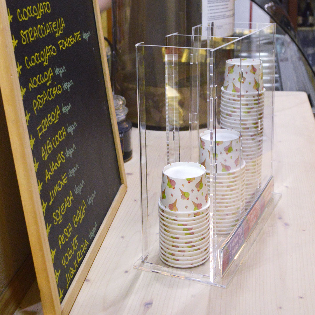 El expositor para copas de helado está hecho de plexiglás de alta calidad, 100% fabricado en Italia, sin tornillos ni adhesivos. Ideal para organizar cucharaditas, pajitas, sobres de azúcar, caramelos y conos en tu mostrador o servicio en mesa.