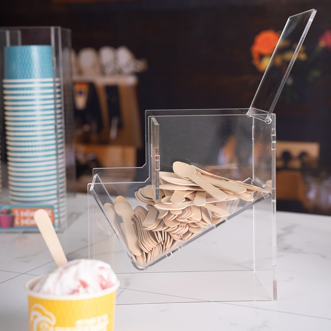 Expositor para cucharitas y paletinas para heladerías y bares. El expositor de mostrador está hecho de metacrilato transparente. El contenedor es ideal para cucharitas para heladería, y también para caramelos, piruletas y cucherias. Limpieza rápida con un paño húmedo (no usar alcohol). Se envía para ensamblar con una película protectora que se debe quitar antes de su uso. Tamaño: 12 x 20 x 20 cm. Añadir al carrito ahora.