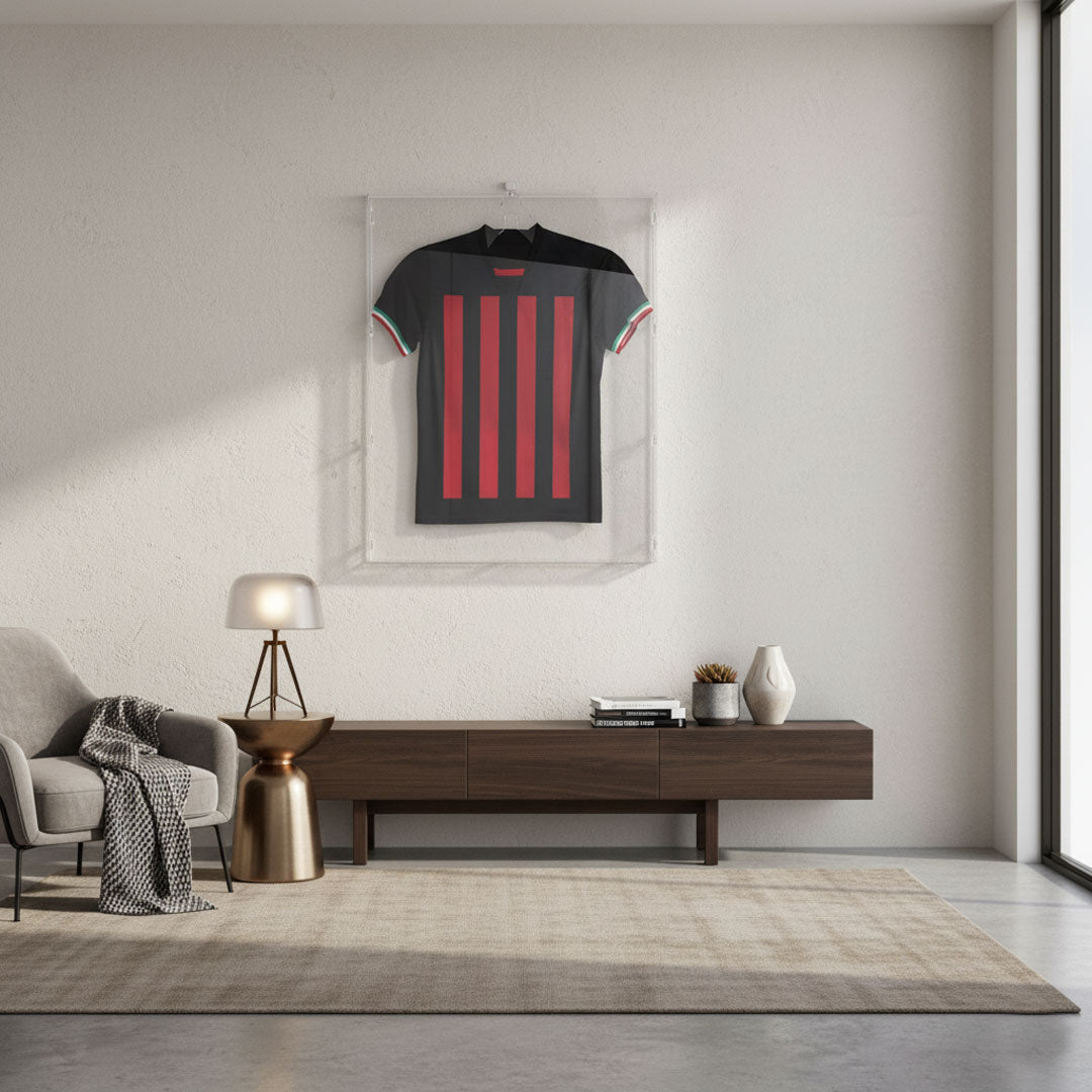 Marco para camiseta de futbol de metacrilato. El marco es completamente transparente, ideal para exhibir camisetas deportivas. El marco de plastico está equipado con un colgador para enmarcar las camisetas sin doblarlas. Disponible en la versión de pared, con espaciadores incluidos, y en la versión sobremesa, con pies de metacrilato. Añadir al carrito ahora.