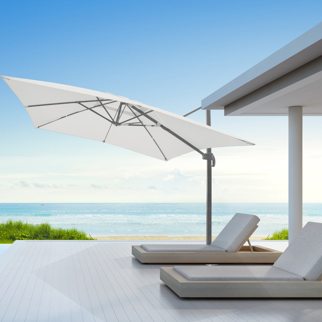 Parasol Excentrico de aluminio rectangular. Sombrilla resistente al viento con chiminea de viento arriba. Sombrilla lateral blanca o antracita con pie de cruz (losetas de hormigón no incluidas). El parasol excentrico es inclinable a lo largo del eje vertical y giratoria 360°. El cierre es retráctil para limitar el tamaño. La lona es en poliéster color nata de forma rectangular. Dimensiones disponibles: 3x4 metros. El parasol excentrico es ideal para hostelería y terraza. Se recomienda un peso mínimo de 85 kg en baldosas. Baldosas no incluidas