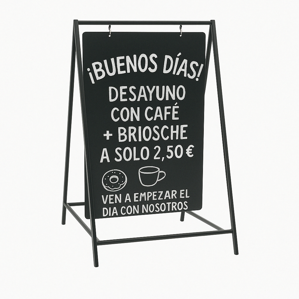 El caballete publicitario está fabricado en acero negro para garantizar resistencia y estabilidad, tanto en interiores como en exteriores. Su aspecto elegante lo hace ideal para cualquier entorno.