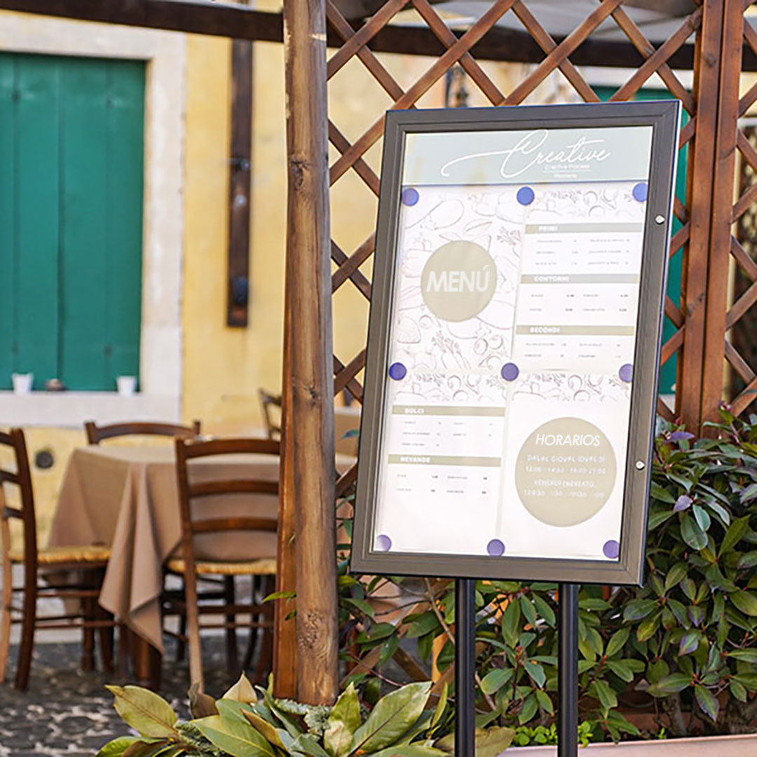Vitrina para exteriores de pie, diseñada para exponer menús de restaurantes y negocios de comida. La vitrina cuenta con una estructura robusta y resistente, con una base de pie para su estabilidad. La anta de policarbonato trasparente protege el menú de roturas y golpes. La vitrina se presenta en dos versiones: con o sin iluminación LED, para mayor visibilidad y atractividad.