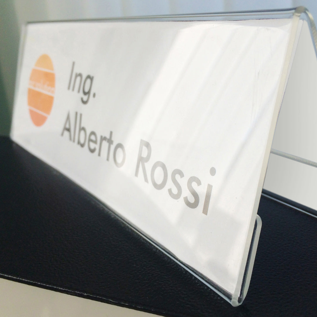 Este porta nombre está protegido por una película adhesiva para evitar arañazos durante el transporte. Antes de usarlo, simplemente retira la película desde una esquina para revelar su claridad total y asegurarte de que el expositor esté listo para mostrar la información de manera impecable.