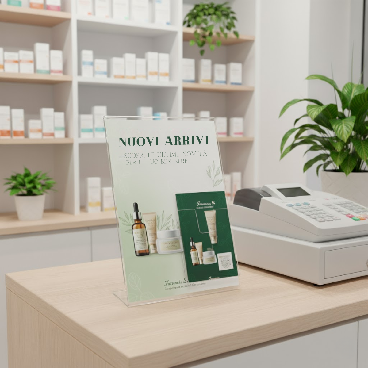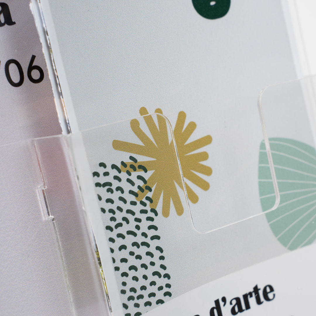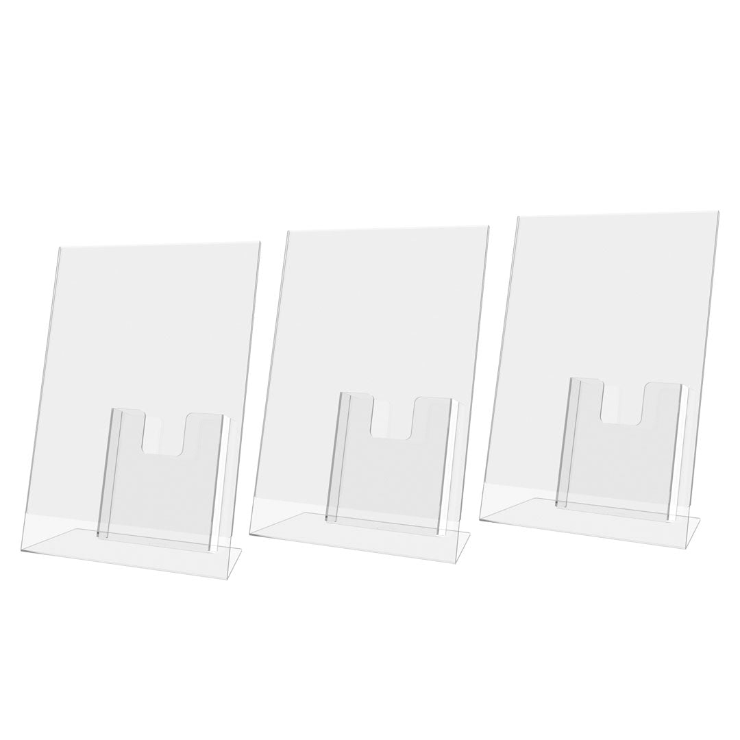 Conjunto de 3 expositores de sobremesa en formato A4 fabricado en metacrilato transparente, equipado con un bolsillo vertical para tarjetas de visita. Es ideal para mostrar avisos, menús o comunicaciones en mesa mientras ofreces a tus clientes la posibilidad de coger tu tarjeta o folleto de presentación. El bolsillo frontal está disponible en cuatro tamaños, adecuados para folletos 1/3 A4, volantes A5 o tarjetas de visita, según tus necesidades de exposición.