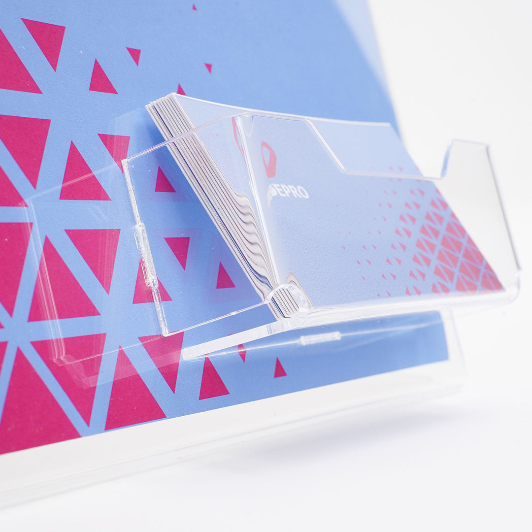 El bolsillo portatarjetas integrado permite ofrecer información adicional —como contactos, promociones o folletos breves— sin ocupar espacio extra. Perfecto para captar nuevos clientes en tiendas, eventos y ferias.