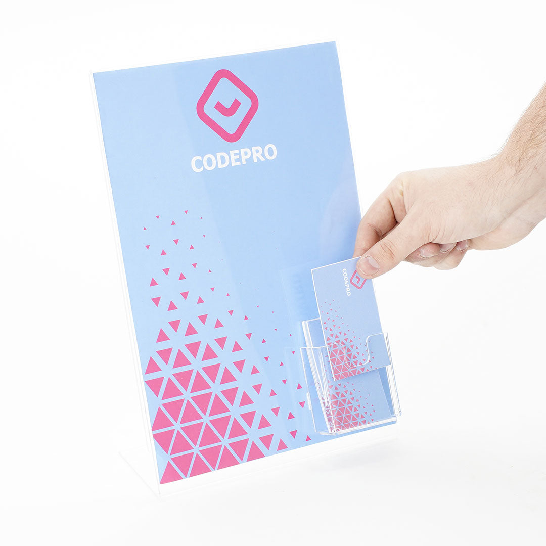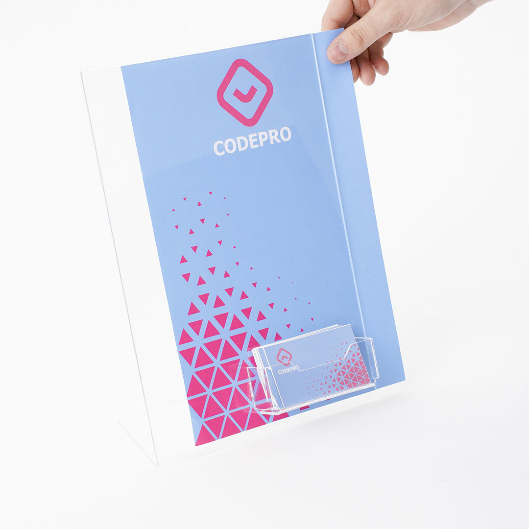 Claro. Tanto el documento A4 como las tarjetas del bolsillo se sustituyen en segundos, lo que lo hace perfecto para negocios que actualizan la información a menudo.