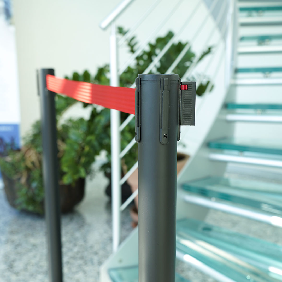 Los postes separadores Danieli Store están equipados con un sistema retráctil y un sistema de autofrenado. Gracias al sistema retráctil, la cinta se enrolla sobre sí misma para desaparecer completamente en el interior de la columna cuando no es necesario utilizarla. Para evitar accidentes durante la fase de retracción de la cinta, interviene el sistema de seguridad autofrenante: una vez soltado, la cinta vuelve lentamente hacia el interior, evitando dañar objetos y personas cercanas.